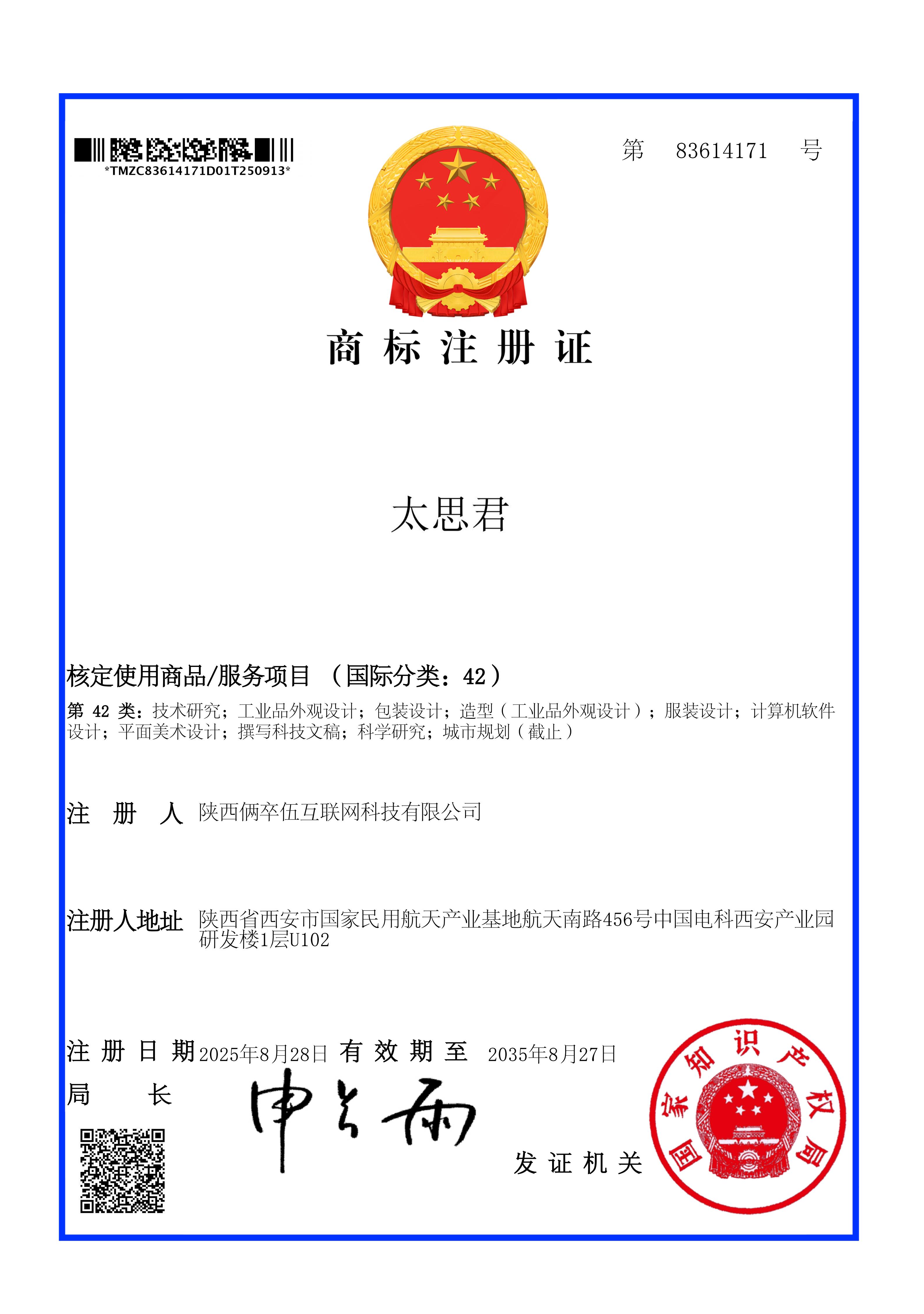 近日,俩卒伍科技有限公司在品牌建设上取得关键性成果,其核心品牌“太思君”已正式获得国家知识产权局颁发的商标注册证。此次成功注册的商标涵盖了第41类(教育、培训、认证考试、组织竞赛等)和第42类(技术研究、计算机软件设计等)关键服务项目。