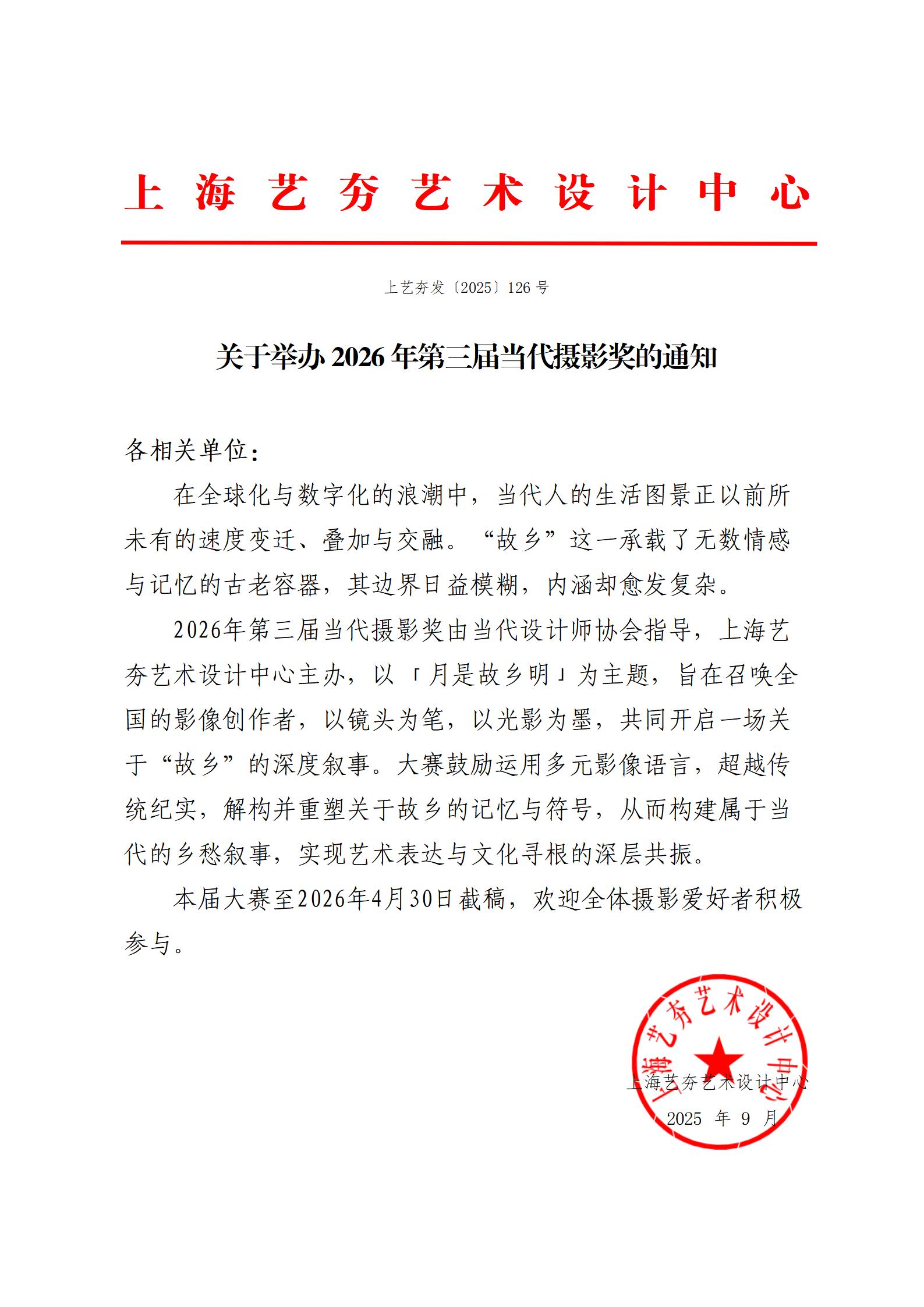 2026年第三届当代摄影奖由当代设计师协会与上海艺夯艺术设计中心共同举办,秋季赛以 「月是故乡明」为主题,旨在召唤全国的影像创作者,以镜头为笔,以光影为墨,共同开启一场关于“故乡”的深度叙事。大赛鼓励运用多元影像语言,超越传统纪实,解构并重塑关于故乡的记忆与符号,从而构建属于当代的乡愁叙事,实现艺术表达与文化寻根的深层共振。